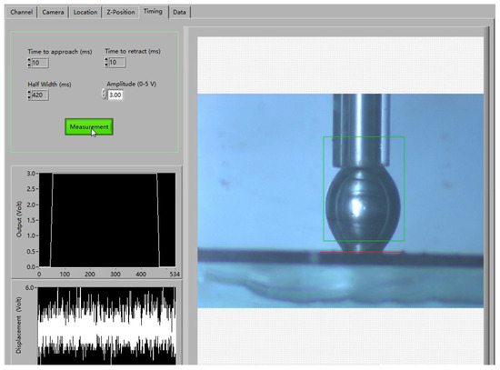 The induction time between the muscovite flakes and the bubble was measured using a 2015EZ induction timer [30] from China University of Mining and Technology, Jiangsu. This study used two methods to measure the induction time of muscovite. One was to directly add DDA into the test sample tank and test the induction time of muscovite flakes under different solution pH; the other was to pre-place muscovite flakes in DDA solution (20 mg/L) for 30 min and test the induction time of muscovite pieces under different pH of solution. Nanobubble water was added directly to the sample tank instead of deionized water, and the muscovite mica pieces were placed at the bottom of the sample tank for 3 min, and then the induction time of the muscovite mica pieces was measured. A trapped bubble of approximately 1.3 mm in diameter was generated and fixed at the end of the bubble tube. The muscovite piece was placed at the bottom of the transparent sample cell, and the initial distance between the bubbles and the muscovite piece was set to 0.35 mm. The speed of bubbles approaching and exiting the particle bed was maintained at 2.23 cm/s. As shown in Figure 5, the bubbles remain in contact with the particle bed for a given contact time. Each experiment was repeated at specific contact times to obtain ten observations at different locations on the particle bed, and the number of observations leading to attachment was counted using a charge-coupled device (CCD) camera. To establish a distribution of induction times (seconds), the contact time is then varied by adjusting the pulse frequency. The measureds value is the time at which five out of ten observations result in bubble-particle attachment.