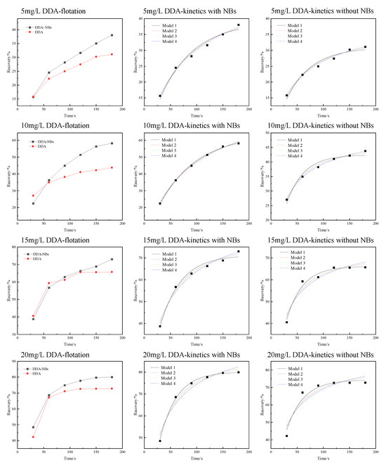 3.1. Flotation Kinetics at Different DDA Concentrations with and without NBs