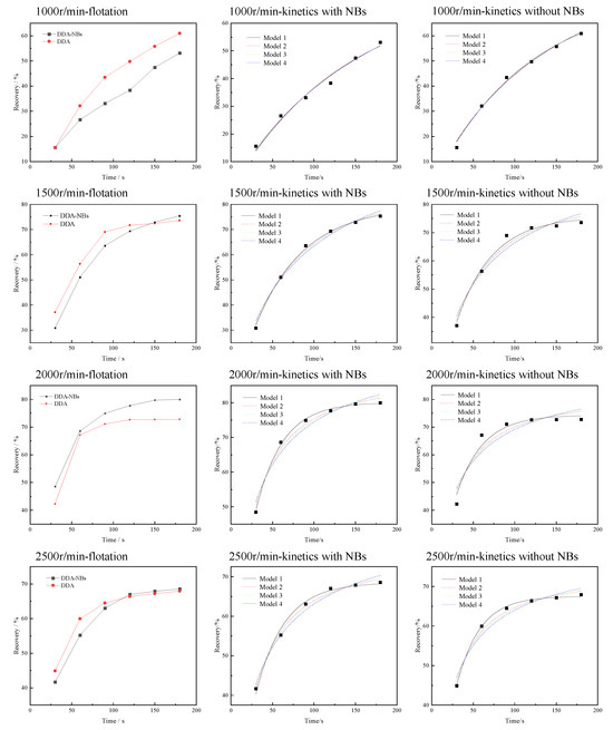 In the process of flotation, the study of flotation kinetics played a vital role in quantifying the influence of various conditions on flotation. It could be seen from the above conditional flotation test that the change in collector concentration, impeller speed, and the pretreatment of a nanobubble aqueous solution would lead to a change in the flotation recovery rate of fine muscovite. In order to determine the most suitable dynamic model for describing the flotation of fine muscovite and find out the change rule of the flotation rate constant itself and with various flotation factors, this section carries out the batch bubble scraping test on the flotation of fine muscovite minerals of −20 μm and uses four classical flotation kinetics models to carry out the fitting analysis of the test data.