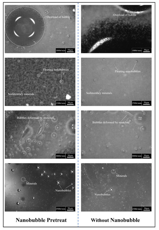 The results of the flotation behavior of nanobubbles and muscovite particles at different stirring speeds are presented in Figure 8. At a low stirring speed (1000 r/min), a thick deposit of muscovite appeared at the bottom of the beaker, as shown in Figure 8. The observations revealed that the incomplete distribution of muscovite mineral particles in the slurry led to reduced interaction between the particles and collector, resulting in a decreased hydrophobicity of the surface of mineral particles and a reduced probability of adhesion to bubbles. Additionally, the excessive adhesion of mineral particles to bubbles and the formation of a thick sediment layer led to bubble overload, further reducing the muscovite recovery rate at low rotation speeds. As the stirring speed was increased to 1500 r/min, the muscovite particles pretreated with nanobubbles began to agglomerate and suspend in the slurry, possibly due to the promotion of nanobubbles [31]. However, even at 1500 r/min, a thick layer of muscovite was still deposited at the bottom of the beaker, suggesting that the nanobubble-enhanced flotation effect was insignificant at this speed. At 2000 r/min, a significant difference was observed between muscovite pretreated with nanobubbles and untreated muscovite, indicating that the stirring speed has reached an optimal level for the nanobubble-enhanced flotation recovery of muscovite ore particles. The well-defined mineral zone around a large number of bubbles that appeared and rose in the muscovite treated with micro-nanobubbles might be attributed to the promotion of agglomeration of mineral particles and the merger of bubbles by nanobubbles. This observation was consistent with the analysis results of the flotation kinetics fitting curve. At 2500 r/min, despite the presence of more nanobubbles in the pretreated muscovite slurry, mineral particles became highly dispersed due to the high shear force generated by the excessively high rotational speed. As a result, the agglomerated muscovite mineral particles bridged by micro-nanobubbles and the large bubbles produced by the merger of bubbles were broken up, thereby reducing the nanobubbles’ strengthening effect. The observation of bubbles deformed by the high flow rates further confirmed the influence of shear force on the flotation behavior of muscovite particles treated with nanobubbles.