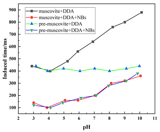 Figure 9 illustrates the results of the induction time measurements of muscovite flakes under different conditions. It is worth noting that the upper limit of the measurement time of the 2015EZ induction timer was 18,000 ms, and the contact time between the bubbles and the muscovite flakes was set to 18,000 ms [32]. Ten attempts were made to contact the bubbles with the mica sheets in a deionized environment. As a result, none of the bubbles adhered to the muscovite flakes. Even after pretreating the muscovite flakes with nanobubble water, the bubbles still could not adhere to the muscovite flakes, which indicated that the natural hydrophobicity of natural muscovite was weak, making it challenging for bubbles to adhere to the surface of muscovite. However, upon adding 20 mg/LDDA to the sample tank, the induction time of muscovite flakes decreased significantly, reaching the shortest time of 400 ms at pH = 4, gradually increasing as the pH of the solution increased. This phenomenon could be attributed to the electrostatic adsorption of DDA on the surface of muscovite. DDA was a cation collector, and its influential ionized cationic groups displayed an apparent regularity with the pH of the solution, appearing around the solution pH = 4 and reaching the highest level of effective group concentration of cations [33,34,35]. This phenomenon was previously reported by Ren et al. [36,37,38,39,40]. When the experimental sample was replaced with DDA-pretreated muscovite flakes, the induction time fluctuated around 400 ms with the pH of the solution, with a fluctuation range of ±20 ms, further verifying the above conclusion. After adding DDA and treating the muscovite flakes in the sample pool with nanobubble water for 3 min, the induction time of the muscovite flakes also decreased. This may be attributed to the nanobubbles pre-adsorbed on the muscovite flakes interacting with DDA. On the surface of muscovite, when the bubbles generated with the induction timer descend, they first come into contact with the nanobubbles adhering to the surface of muscovite and then merge with the bubbles, thereby increasing the adhesion probability of the bubbles and reducing the induction time of the muscovite flakes.