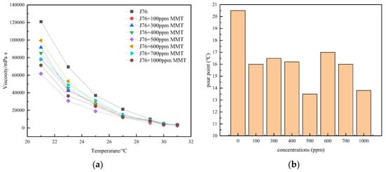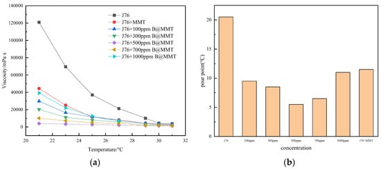 The effect of the amount of modified montmorillonite on the viscosity of crude oil was investigated. From Figure 5a, it can be seen that the viscosity reduction effect was remarkable in the low-temperature range. At 21 °C, the viscosity of the oil sample with 500 ppm B@MMT was only 3980 mPa·s (21 °C), which means that the viscosity was reduced by 96.7% (21 °C). The pour point was depressed to 5.5 °C and the viscosity reduction rate of 500 ppm was higher than that of other dosages. Therefore, the dosage of 500 ppm was determined for the following studies.