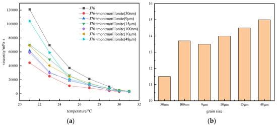 The effect of montmorillonite dosage on the viscosity and pour point of J76 crude oil was evaluated first, and the results are summarized in Figure 1. Montmorillonite with a 9 μm particle size was used in this part. It can be clearly seen from Figure 1a that the effect on viscosity was significant in the temperature range of 21~25 °C. The dosages of 1000 ppm and 500 ppm have the most significant effect on crude oil viscosity at 21 °C. The viscosity was reduced to 71,300 mPa·s (21 °C) with 1000 ppm montmorillonite, and further to 61,700 mPa·s (21 °C) with 500 ppm montmorillonite, and the pour point was depressed to 13.5 °C. For the subsequent study, the dosage of montmorillonite was determined to be 500 ppm because it can lower the freezing point and reduce the viscosity relatively more.