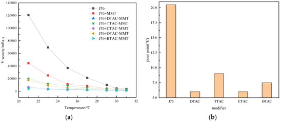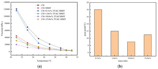 The effect of modifier (quaternary ammonium salt) dosage used in modification on the viscosity reduction effect of modified montmorillonite was investigated, using tetradecyltrimethylammonium chloride (TTAC). The viscosity reducing effect of modified montmorillonite was evaluated as the mass ratios of modifiers were 0.1 wt%, 1, 10 and 15 wt%, respectively. As can be seen from Figure 3a, the viscosity reduction effect was slightly lower at lower modifier dosages, and the highest viscosity reduction rate of 83.4% (21 °C) was achieved at 10 wt%. The pour point is depressed to 9.0 °C (Figure 3b). Therefore, montmorillonite modified by the 10 wt% modifier was selected for subsequent experiments.
