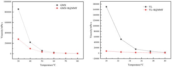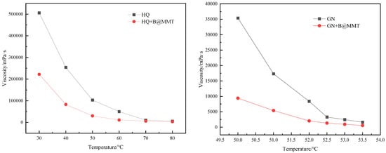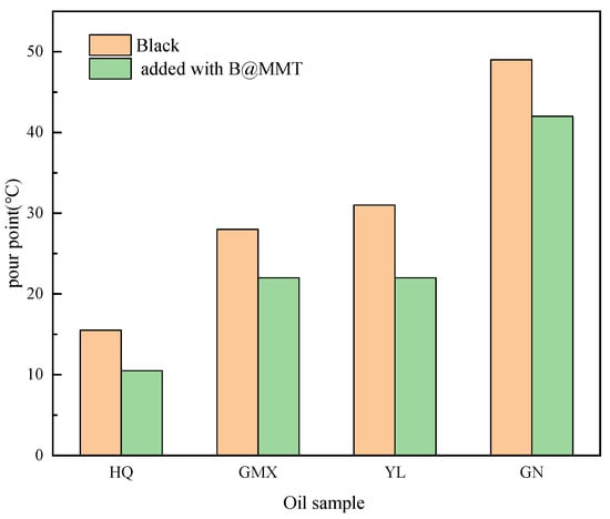 The universality of the flow improver is an important factor concerning the application; therefore, in this work, the viscosity reducing effect of B@MMT on Xinjiang Hasho oil sample (HQ), Muxiu oil sample (GMX), Yanglou oil sample (YL) and North China high condensate (GN) was evaluated. The viscosity change in these crude oils is shown in Figure 6, and the pour point change is shown in Figure 7. The viscosity of the HQ oil sample with the addition of B@MMT was reduced by 56.1% (30 °C), and the pour point was depressed by 5.0 °C. The viscosity of the GMX oil sample with the addition of B@MMT was reduced by 67.4% (30 °C), and the pour point was depressed by 6 °C. The viscosity of the YL oil sample with the addition of B@MMT was reduced by 93.4% (30 °C), and the pour point was depressed by 9 °C. The viscosity of GN oil with the addition of B@MMT was reduced by 73.4% (50 °C), and the pour point was depressed by 7 °C. The aforementioned research shows that B@MMT is somewhat universal and has a wide range of potential applications.