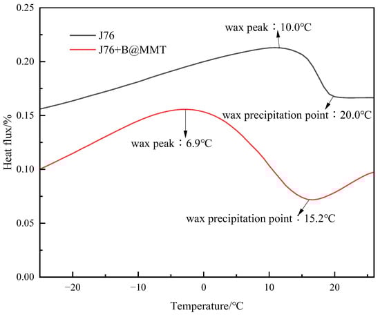 As the temperature decreases, the wax in the crude oil begins to precipitate and grow, forming a three-dimensional network structure that restricts the flow of liquid hydrocarbons until the entire crude oil loses its fluidity. The thermal behavior of the wax precipitation process of J76 crude oil before and after the addition of nano-modified montmorillonite B@MMT was investigated using differential scanning calorimetry (DSC). From Figure 8, is clearly visible that the wax precipitation point decreased from 20.0 °C to 15.2 °C, and the temperature peak of wax precipitation decreased from 10.0 °C to 6.9 °C. This indicates that the added nanoscale-modified montmorillonite inhibited the wax precipitation from the crude oil, thus reducing the wax precipitation point and wax precipitation peak temperature of the oil samples. The macroscopic effect of condensation reduction and viscosity reduction in the low-temperature range of crude oil was manifested, which may be attributed to the effect of nano-modified montmorillonite co-crystallizing with waxes, inhibiting the precipitation of wax crystals and dispersing wax crystals.