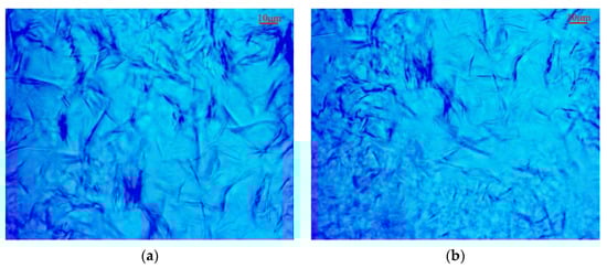 The effect of nanoscale-modified montmorillonite on wax crystal morphology in saturated hydrocarbons from J76 crude oil was analyzed by optical microscopy at low temperature. The number of wax crystals in the saturated hydrocarbons without B@MMT was enormous and very close, and it is easy to build a network structure, as shown in Figure 9. The number of wax crystals was small and somewhat loose after adding B@MMT, making it difficult to construct a network structure. This suggests that nano-modified montmorillonite exerts an inhibitory effect on wax crystallization and reduces the number of wax crystals at a certain temperature, which can reduce the viscosity of crude oil at that temperature.