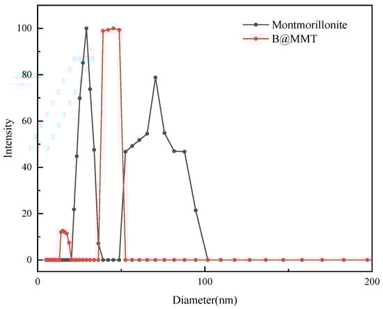 The particle size of montmorillonite and B@MMT was analyzed with a zeta potential particle size analyzer. It is clearly visible from Figure 10 that the unmodified nano-montmorillonite raw material coexists with large and small particles, and the modified montmorillonite has a more uniform particle size, with particle sizes concentrated in a very small range. The average particle size of unmodified montmorillonite was of 53.97 nm, and in the contrary for B@MMT it was of 45.33 nm. This also shows that the modifier effectively reduces the specific surface energy of the nanomaterial, making it more dispersed and the making the particle size smaller.
