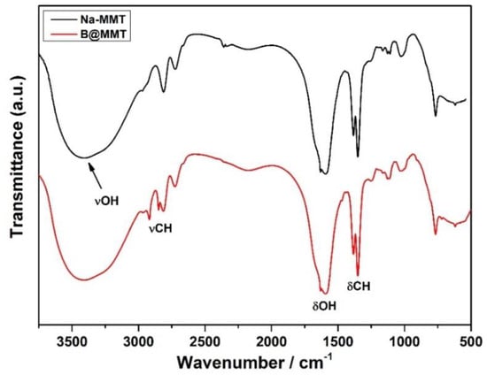 Comparative analysis of montmorillonite and B@MMT was carried out using FTIR spectroscopy and the results are shown in Figure 12. The new absorption bands at 2973 cm−1, 2846 cm−1 and 2917 cm−1 are attributed to the stretching vibration of the CH vibration band. The new absorption band at 1110 cm−1 is attributed to C-N stretching vibrations. Absorption bands at 1340 and 1381 cm−1 are attributed to the bending vibration of the -CH band, thus proving that the BTAC has been loaded on the montmorillonite.