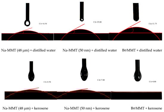 The 48 μm montmorillonite, 53.97 nm montmorillonite and modified montmorillonite were pressed into thin sheets. The contact angle was measured by adding drops of distilled water and kerosene, and the results are shown in Figure 13. A comparison of the contact angles shows that the contact angles of 48 µm montmorillonite, 20 nm montmorillonite and modified montmorillonite with distilled water increased in that order, and the modified montmorillonite had the largest contact angle with water, which reached 31.75°. The results show that the hydrophobicity of montmorillonite was enhanced after modification, but it still belongs to the hydrophilic category, indicating that most of the hydroxyl groups on its surface are not changed or covered. The contact angles of 48 μm montmorillonite, 20 nm montmorillonite and modified montmorillonite with oil decreased in that order, and the contact angle of modified montmorillonite with oil approached 0°. The above experimental results show that montmorillonite has amphiphilicity, the surface modification by quaternary ammonium salt slightly reduces the hydrophilicity, the lipophilicity was visibly improved and the prepared modified montmorillonite still has amphiphilicity.