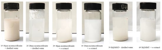 The same mass of montmorillonite with different particle sizes were taken in special sample bottles and distilled water and n-octanol were added. The samples were treated by using ultrasonic treatment for 3 h, and after the end of the treatment, they were left at room temperature to observe the phenomena.