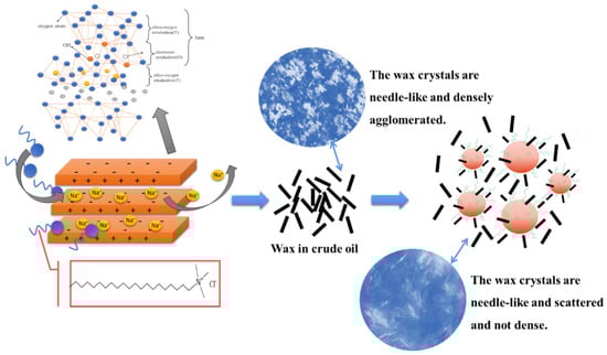 The resin and asphaltenes in crude oil contain a large number of polynuclear aromatics, acyl groups, hydroxyl groups, amine groups, sulfhydryl groups and heterocyclic structures, which form a network structure through hydrogen bonding, π-π stacking and so on, forming part of the viscosity of crude oil. The surface of B@MMT has a large number of silicon hydroxyl and aluminum hydroxyl groups, which can form hydrogen bonds with the above groups, block or weaken the interaction between resin and asphaltene and partially dismantle the network structure [], so as to achieve the viscosity reduction effect on crude oil (Figure 15). As the temperature lowers, the originally dissolved wax in the crude oil will precipitate and aggregate to form a three-dimensional network structure, resulting in a sharp increase in the viscosity of the crude oil. In the above study, it can be seen that B@MMT has a significant reduction effect on the viscosity of crude oil in the low-temperature region, which is due to the fact that the long-chain alkyl groups on the surface of B@MMT can co-crystallize or adsorb with wax crystal molecules, dispersing the wax crystals, and it can change the crystalline structure of the waxes [], preventing the wax crystals from growing up to form a network structure (Figure 16).