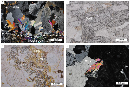 (a) Microphotograph of combed micas growing from the contact with the host rock marked by dashed line. (b) Euhedral spodumene crystals of up to 8 mm. (c) Eucryptite (Ecp) (yellowish) and cookeite (Ckt) (uncolored) replacing spodumene (Spd) crystals, with some relicts of Spd. (d) Anhedral crystal of montebrasite (Msb) with a slight twinning.