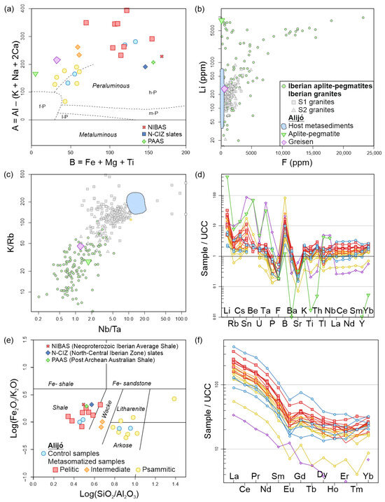 (a) Multicationic [B] vs. [A] diagram from [51] modified by [52], showing compositions of the selected aplite-pegmatite, greisen, and host rocks from Alijó. (b) Bivariate plot displaying F vs. Li (logarithmic) of the same set of samples (Iberian aplite-pegmatites, S1 granites, and S2 granites also shown for comparison; data taken from [13]. (c) Nb/Ta vs. K/Rb diagram (logarithmic) of the same three types of studied rocks. (d) Spider plots of the studied spodumene-pegmatite, host metasediments, and greisen normalized to the upper continental crust (UCC; [53]). (e) Classification diagram of siliciclastic sediments [54], showing compositions of the studied metasedimentary host rocks. Compositions of the Neoproterozoic Iberian Average Shale (NIBAS; [55]), average of North-Central Iberian Zone (N-CIZ) slates [56], and Post Archean Australian Shale (PAAS; [57]) are also displayed for comparison. (f) Chondrite-normalized [58] REE diagrams of the host metasediments.