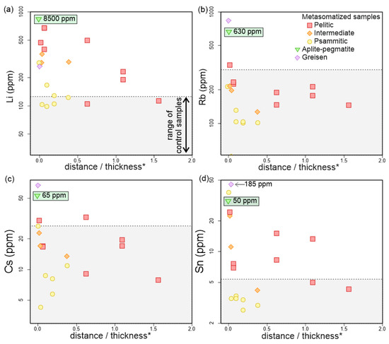 Binary diagrams showing (a) lithium, (b) rubidium, (c) cesium, and (d) tin concentrations in the studied host metasediments displayed relative to the distance from the dyke (*), i.e., the distance from the dyke divided by the thickness of the dyke (range of non-metasomatized control samples also displayed in grey for comparison).
