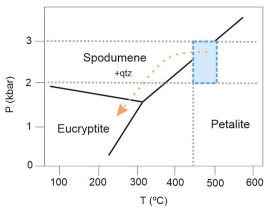 Moreover, Li-aluminosilicates may help in interpreting the crystallization conditions [20,69]. The presence of both primary and secondary spodumene indicates that, in addition to crystallizing directly from the pegmatitic melt, some of the spodumene crystals in the dyke have been formed during subsolidus processes. These secondary crystals were most likely formed as the result of the replacement of primary petalite by a spodumene + quartz intergrowth [SQI texture] [70,71,72,73]. As shown by the P-T phase diagram for Li-aluminosilicates (Figure 8), the textural and paragenetic relationships suggest a rapid T decrease to allow the coexistence of primary and secondary spodumene with late eucryptite. Considering that the maximum conditions of regional metamorphism for the host rocks are ~3 kbar [30] and that the minimum crystallization temperature for K-feldspar to show lattice twins is 450–500 °C, the primary crystallization of the Alijó pegmatite is proposed to have occurred within the range of 450–500 °C and 2–3 kbar (blue rectangle with dashed-line in Figure 8). This is consistent with the simultaneous crystallization of spodumene and ‘non-preserved’ petalite. The secondary mineral paragenesis of the studied dyke also indicates that the magmatic–hydrothermal transition in the evolution of the studied spodumene-bearing pegmatite continued up to eucryptite stability conditions (Figure 8). The replacement of spodumene crystals by eucryptite and cookeite is evidence of low-temperature metasomatism in a subsolidus stage. However, recent studies show that the stability of Li-aluminosilicates is more complex than previously thought, suggesting that P and T may not be the only factors controlling the crystallization of these minerals [72,73].