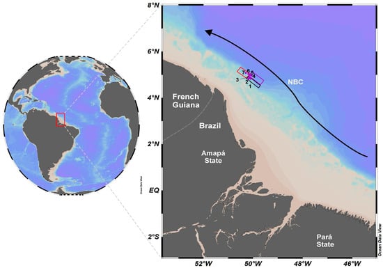 The Brazilian Equatorial Margin (BEM) developed during rifting and spreading of the South Atlantic Ocean at the end of the Early Cretaceous [1]. The main rifting phase resulted in the development of five coastal sedimentary basins, named, from east to west: Potiguar, Ceará, Barreirinhas, Pará-Maranhão, and Foz do Amazonas [2,3]. The BEM is located within the latitudinal range of the Intertropical Convergence Zone (ITCZ). Studies show a link between the latitudinal position of the ITCZ and the meridional displacement of warmer waters, which correlates with rainfall volume [4,5,6]. In particular, the western BEM is influenced by the Amazon River plume, an intense freshwater discharge flowing westwards alongside the North Brazilian Current (NBC, Figure 1) [7,8,9]. The NBC is a high-intensity stream flowing from the Tropical Atlantic Ocean towards the North Atlantic Ocean, which transports heat and salt from the equator to feed the Gulf Stream in the Gulf of Mexico. In general, the BEM may influence the mechanisms triggering the formation of deep-water masses such as North Atlantic Deep Water, thus influencing the global climate [10,11,12,13]. A cruise campaign was recently conducted with the general objective of investigating areas of possible occurrences of biogenic formations in the Brazilian Equatorial Margin (BEM or MEq in Portuguese) region, through high-resolution geophysical mapping, as well as imaging the area and collecting benthic organisms. The comprehension of ecosystem dynamics, especially in marine sediments at substantial depths, also relies significantly on understanding the composition of microbial communities [14]. In these environments, the presence of chemosynthetic bacteria and archaea is pivotal, as they play a crucial role in the energy processes essential for sustaining these ecosystems [15]. This ecosystem is found in mesophotic zones, which is consensually defined as a zone in tropical and subtropical regions extending between a 30–40 m and ~150 m water depth [16]. Defining the possible actions for the future survival of this marine ecosystem is strongly dependent on accurate characterization. For this reason, it is important to map its spatial distribution and extension to orient future research and inform management plans and conservation measures [17,18,19].