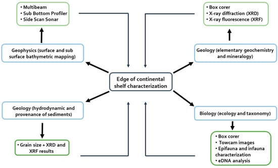 The methodologies associated with geophysics, geology, and biology (Figure 2) used in the work allowed us to perform a preliminary characterization of the ACS. More specifically, those methodologies allowed the study of geophysics mapping, hydrodynamic reconstruction, provenance of sediments, elementary geochemistry, mineralogy, ecology, and taxonomy, which led to the recognition of the morphological, geological, and biological features of the edge of the continental platform.