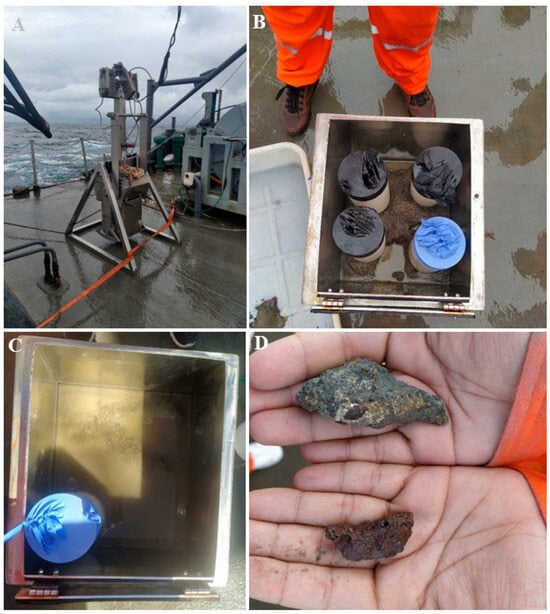 The Brazilian Navy ship, NPqHo Vital de Oliveira, is equipped with a Box Core (model 80.100, KC Denmark, DK) with a capacity of 40 L (Figure 3A), using the 80.101-50 sample tube box (40 × 37 × 56 cm). At each site, the box core was deployed twice, once for geological, chemical, and microbiological assessment (Figure 3B) and once for infaunal assessment. One site included 3 deployments due to the poor sediment retention. Once the box core containing sediment was retrieved and secured onboard, the sediment box was carefully detached from the frame and placed on the deck as rapidly as possible, ready for subsampling. The recovery from the box core was low at sites 4 and 5 (Figure 3C) due to the presence of a ferruginous crust (Figure 3D) on the seafloor.