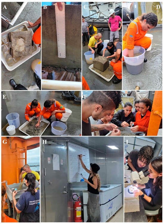 Sampling of macrofauna with a box corer during the research campaign. (A) Total sediment sample from the box core for faunal sampling; (B) selection of the bioturbated upper portion of the sediment for sieving; (C) cutting and removing the sediment layer of interest; (D) sediment elutriation; (E) capture of living organisms identified in the sediment; (F,G) screening of the sediment in the set of 1.0 and 0.5 mm sieves; (H) registration of collection information; and (I) screening and identification in the Vital de Oliveira wet laboratory of live taxa before preservation.