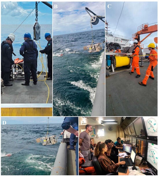 Bottom imagery was collected in an area of interest within Area 2, with the aim of characterizing the community of benthic and bentho-pelagic megafauna though the TowCam (Figure 5). A rounded negative feature, consistent with a “pockmark”, was identified in bathymetric mapping, thus the transect line was selected to attempt to pass over this pockmark feature. The TowCam system (prototype model BMPTech, Campo Grande, Brazil) consists of a rectangular frame with rear “wings” comprising the towed vehicle, containing an HD video camera (1080p video and 4k photos), two high-power LED light sources, and a PSA-916 Sonar Altimeter (Teledyne, North Falmouth, MA, USA). The live video image is used to control decision-making regarding tow speed and altitude above the seafloor during the dive. This vehicle is towed by a fiber optic umbilical cable operated with an associated winch (prototype model BMPTech, Campo Grande, Brazil, 2.1 × 1.2 × 1.3 m). It holds 1300 m of cable (electromechanical + optical fiber) sufficient for operation at depths between 250 and 1300 m.