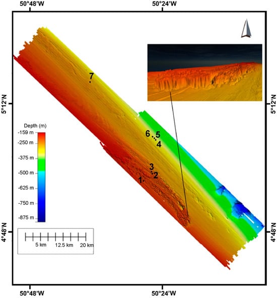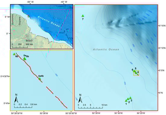 The study region of the scientific cruise was located along the BEM near the Oiapoque region, Amapá State in Brazil and the northern Brazilian maritime border with French Guiana. This study region was subdivided into three areas (named areas 1, 2, and 3, Figure 1) to facilitate the organization of data acquisition. Located on the wide Amazonian continental shelf (~300 km), this region evolved from a carbonate to a siliciclastic system during the early Late Miocene (9.5–8.3 Ma) [23,24,25,26]. At this time, under lowstand sea level, an incised canyon system directed sediment influx toward the slope and basin floor [27]. Shelf edge reef buildups occurred peripherally to the deep Amazon Fan and were gradually overlain by siliciclasts during the Neogene and Quaternary highstands [27,28]. Recently, a study of the French Guiana Shelf revealed beachrock from the last glacial maximum sea level drop [29]. At present, the high sediment load from the river settles relatively quickly on the inner and mid shelves, resulting in an unstable muddy benthic habitat, with previous findings of high bacterial biomass and low diversity and an abundance of epifauna and meiofauna [30,31,32]. The region is also subjected to a highly energetic physical regime because of the fast-flowing NBC, strong wind stress, and high semidiurnal tidal ranges. Such conditions create a high-stress habitat for benthic megafauna, especially in the areas with soft, fluid sediments. The high sedimentation and sediment reworking on the inner and mid shelves have been comprehensively surveyed in the last decades, including the core river–ocean biogeochemical processes [30].