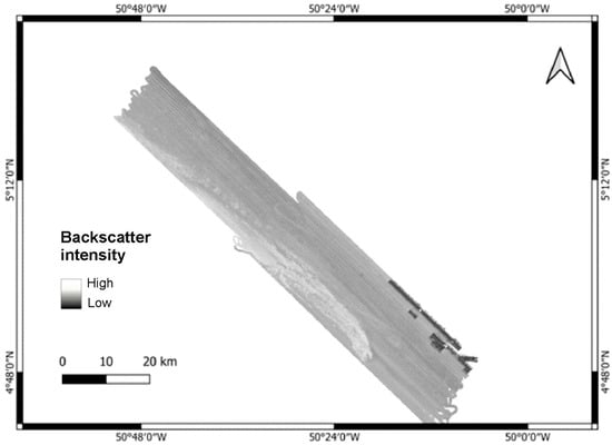 Backscatter map of the region, where the rocky bed exhibits higher contrast than the rest of the area with a very strong reflection.