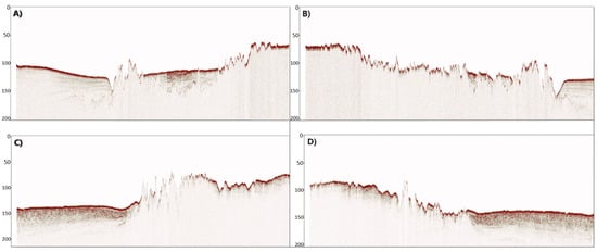 The analysis of shallow seismic data suggests the presence of a complex topography in the form of a predominantly rocky bottom with interspersed muddy areas in association to the extensive structures observed in the bathymetric profile. The seismic data indicate the presence of irregular structures that, at certain moments during the acquisition, exhibited high acoustic reflectivities (Figure 8). This suggests that the irregularities detected in the seismic data may be attributed to specific subsurface features causing variations in the reflection of acoustic waves.