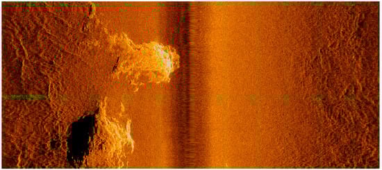 The initial analysis of side-scan sonar data indicated the presence of a target with strong reflectivity, contrasting with weaker reflectivity in the surrounding areas (Figure 9). The robust reflectivity signal suggests the existence of a rigid substrate, such as rock, while the weaker signal indicates the presence of a softer substrate, such as sand and mud. Additionally, as observed in the bathymetry, backscatter, and shallow seismic analyses, the sonar data also indicate the presence of hard substrate in the region.