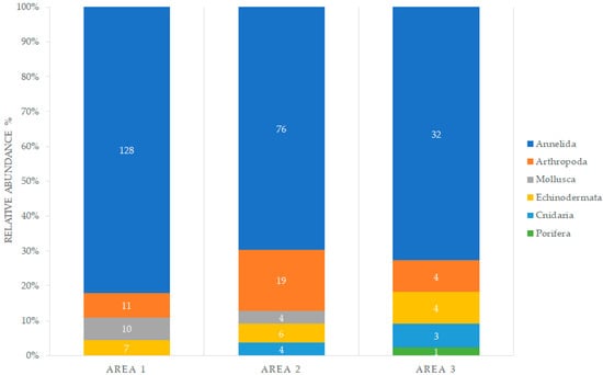 Relative abundance of macrofauna by phyla, collected with a box corer in areas 1, 2, and 3.
