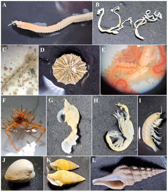 Examples of macrofauna collected with the box corer in areas 1, 2, and 3. Phyla Annelida: (A) Eunice sp.; (B) Priapulidae; (C) polychaete tube. Phylum Cnidaria: (D) Scleractinia, prov. Deltocyathus. Phylum Echinodermata: (E) Ophiuroidea. Phylum Arthropoda, Class Crustacea: (F) Piscidae crab; (G) Cirripedia; (H) Decapoda Thalassinidea; (I) Isopoda. Phylum Mollusca: (J) Bivalvia; (K,L) Gastropoda.