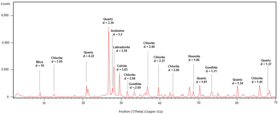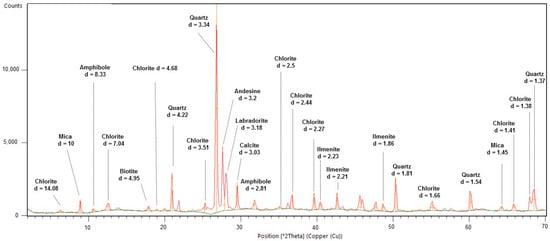 Mineralogical analysis revealed that sample MEQ 5B-3 was composed of calcite, quartz, biotite, amphibole, labradorite, andesine, ilmenite, and chlorite (Figure 13). The sample MEQ 6A-1 showed a similar composition to the previously described sample. The main minerals found with distinguished peaks were quartz, calcite, goethite, ilmenite, chlorite, biotite, andesine, and labradorite (Figure 14).