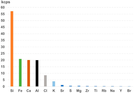 This technique consists of detecting the characteristic X-ray from chemical elements through the photoelectric effect, as each element releases a specific quantity of energy, which allows its identification [44]. The energy source (X-ray) excites an electron from the innermost shell energy level (layer of lower energy, e.g., K, L, M) of the component atoms; its ejection generates a vacancy in that shell, destabilizing the atom. This empty space will thus be filled by an electron from an outer shell energy level that will necessarily release energy (photon) as it transitions to the lower energy layer [45]. This energy is measured using its characteristic line transitions. Thus, if an electron transitions from energy level L to K, Kα emission lines are registered by the detector. If this transition takes place from energy level M to K, then Kβ lines are recorded [45]. All the results are presented in counts per second.