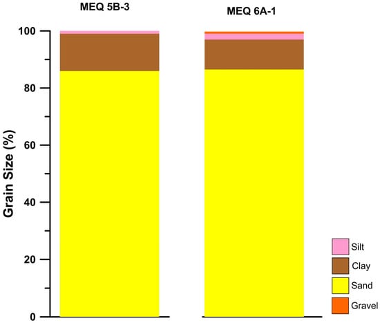 The grain size analysis from both top depth intervals from MEQ 5B-3 and MEQ 6A-1 showed that they contain similar percentages of components (Figure 16) and poorly sorted grains, and were classified as very fine sand. The sample MEQ 5B-3 comprised sand (85.97%), silt (13.07%), and clay (0.96%), whereas the sample MEQ 6A-1 comprised sand (86.47%), silt (10.51%), clay (2.16%), and gravel (0.86%).