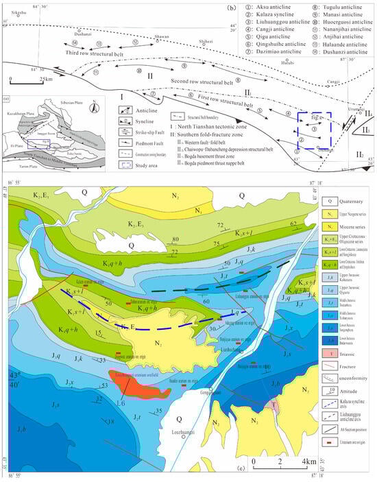The southern area of the Junggar Basin spans the North Tianshan tectonic zone and the southern fold-fracture zone (Figure 1a) [28,29]. The southern fold-fracture zone unit comprises four secondary tectonic subdivisions: the western fault-fold belt; the Chaiwopu–Dabancheng depression structural belt; the Bogda basement thrust zone; and the Bogda piedmont thrust nappe belt (Figure 1b) [30]. Since the Cenozoic era, the collision and sustained compression between the Eurasian and Indian plates have precipitated robust thrusting and nappe formations within the meso-Cenozoic strata along the southern margin of the Junggar Basin. Consequently, three distinct rows of thrust and fold belts have emerged, extending predominantly in an east–west direction within the western fault-fold belt [31,32,33,34]. The Luozhuangzi U deposit is situated in the eastern segment of the western fault-fold belt, primarily influenced by the Kalaza syncline and Liuhuanggou anticline (Figure 1b,c).