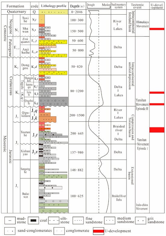 The study area exhibits diverse stratigraphic sequences spanning from the Mesozoic to the Quaternary periods, encompassing Jurassic, Cretaceous, Paleogene, Neogene, and Quaternary formations (Fm) (Figure 1c). The middle and lower Jurassic Fm are characterized by lake-fluvial facies sedimentation with abundant paleontological fossils, including the Badaowan Fm (J1b) (coal-bearing), Sangonghe Fm (J1s), Xishanyao Fm (J2x) (coal-bearing), and Toutunhe Fm (J2t). The Upper Jurassic Fm, including the Qigu–Kalaza Formation (J3q-J3k), primarily exhibits red variegated sedimentation, indicating an arid–hot paleoclimatic environment (Figure 2).