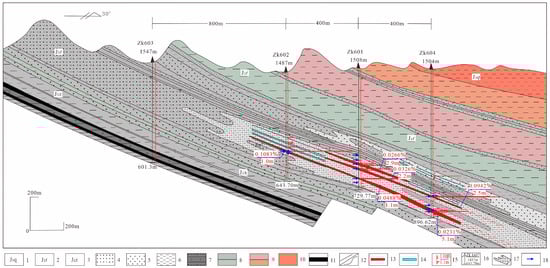 A schematic cross-section (L6) showing the spatial positions of the U-ore bodies considered in this study, modified from [20]. 1—Qigu Fm; 2—Toutunhe Fm; 3—Xishanyao Fm; 4—sand–conglomerate; 5—sandstone; 6—mudstone; 7—gray-blackish carbonaceous mudstone; 8—gray, gray-green color; 9—variegated color; 10—brown color; 11—coal; 12—lithological boundary and formation contact boundary; 13—U-ore body (U% > 0.01%); 14—U-mineralized sandstone; 15—gamma log curve and grade (%) of ore body (m); 16—drill holes with elevation and depth annotations; 17—grayish white alteration zone; 18—sampling location.