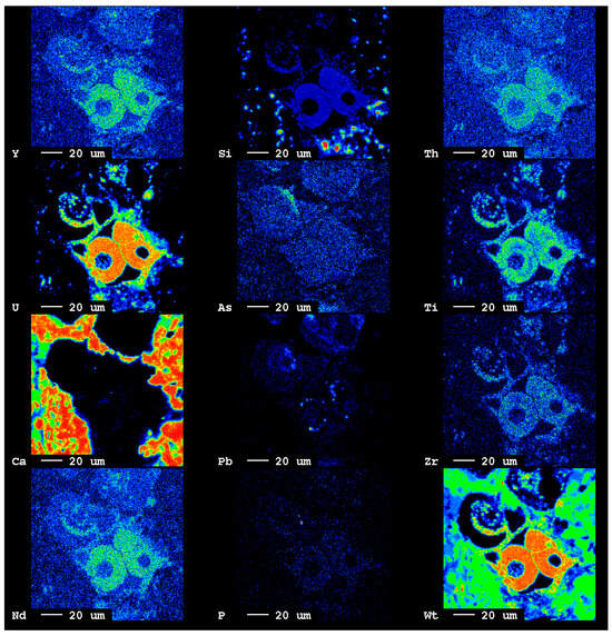 The EPMA verified that the U minerals in the U-ores comprised mainly pitchblende and coffinite. The content of UO2 represented between 57.5% and 86.4% (n = 22), and it was rich in S, Fe, P, Y, Ti, Zr, Nd, etc. The mapping images showed that Y, Th, Ti, Nd, and Zr were synchronously enriched (Figure 6).