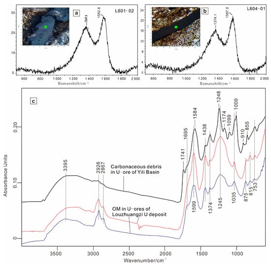 Raman (a,b) and infrared spectra (c) of the OM in U-ores at the Louzhuangzi U deposit, Junggar Basin, and the Honghaigou U deposit, Yili Basin.
