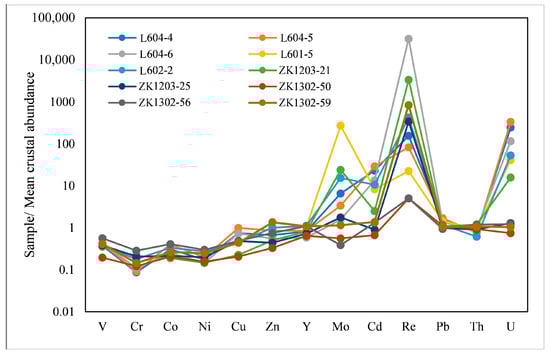 The content of the characteristic elements was very low in the primary barren sandstone of the Toutunhe Formation (Table 3). Compared with the CLARKE value (crustal abundance), the barren sandstone was characterized by the loss of V, Cr, Co, Ni, Cu, Zn, etc. Meanwhile, the content of U, Th, Pb, and Y was similar to their CLARKE values; Re had a certain degree of enrichment in the coal-bearing sandstone, and the enrichment ratio reached 5~387 times its CLARKE value. However, the content of U, Re, and Mo in the U-ores was generally high and often more than 100 times their CLARKE values (the maximum values of U and Mo were 344 and 269 times their CLARKE values, respectively). In some cases, it was more than 1000 times their CLARKE values (the maximum of Re was up to 31,751 times its CLARKE value). This was especially pronounced in the rich U-ores (Figure 8), and elements such as Cd, Cu, Zn, and Y were also enriched to a certain extent, as their values were generally more than twice as high as those in the barren sandstone. This enrichment is consistent with the abundance of metal sulfur observed in the U-ores, which are rich in pyrite and sphalerite, as observed via SEM.