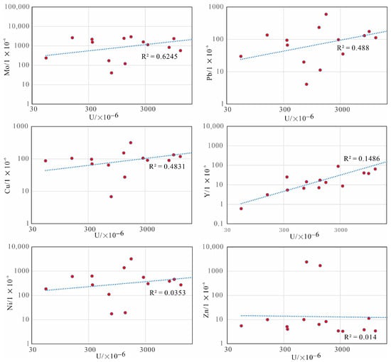 Diagrams representing the relationship between typical trace elements (Mo, Pb, Cu, Y, Ni, Zn) and the U content.