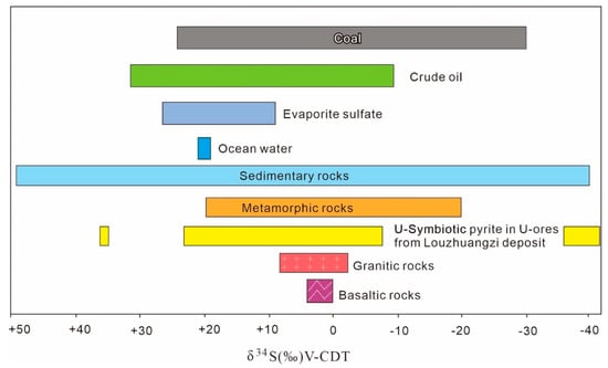 Sulfur isotope distribution of U-symbiotic pyrite from the Louzhuangzi U deposit and typical rock and energy resources (modified from references [35,38,39]).
