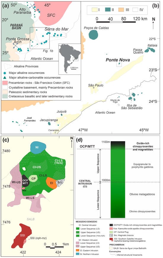 (a) Geological setting of alkaline intrusions of Cretaceous magmatism in the southeastern part of the South American Platform showing the distribution of major alkaline occurrences of Alto Paranaíba, Serra do Mar and Ponta Grossa Arch alkaline provinces (modified after [20]). (b) Detail of (a), with the location of the main occurrences. Legend: I—Sediments or sedimentary rocks (Cenozoic); II—Alkaline complexes (Meso-Cenozoic); III—Sedimentary rocks of the Paraná Basin (Ordovician-Silurian); IV—Crystalline Basement, Brasília and Ribeira orogenic belts (Precambrian). (c) Simplified geological map of the Ponte Nova alkaline mafic–ultramafic massif (modified after [20]). (d) Schematic model of the lithostratigraphy of the studied rocks, after [36].