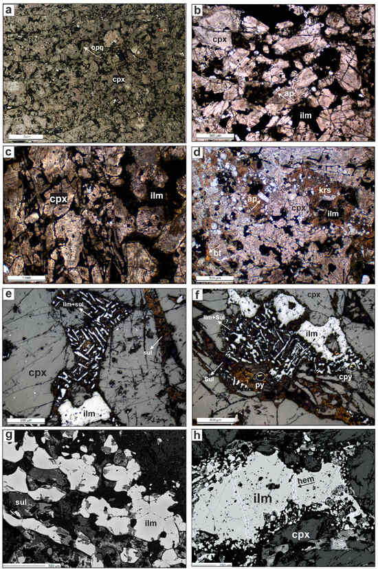 Petrographic aspects of the OCP facies. (a) OCP scanned thin section. Transmitted and plane-polarized light: (b) Photomicrograph of OCP cumulatic texture and mineral assemblage constituted of clinopyroxene, ilmenite and apatite (granular and acicular) disseminated through the matrix. (c) Orientation and compaction structures. (d) Apatite-rich domain with subordinate kaersutite, ilmenite and biotite. Reflected and plane-polarized light: (e,f) Anhedral and acicular ilmenite associated with cumulus clinopyroxene and weathered sulfides along fractured zones. Backscattered electron image (BSE): (g) Ilmenite (in triple-junction contacts) and sulfides; and (h) Ilmenite corroded rims and substitution by hematite along fractures. Abbreviations: bt—biotite, cpx—clinopyroxene, cpy—chalcopyrite, hem—hematite, ilm—ilmenite, py—pyrite, sul—weathered sulfide, opq—opaque minerals.