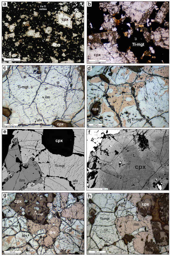 Petrographic aspects of the MTT facies. (a) MTT scanned thin section. Transmitted light: (b) Photomicrograph of MTT cumulatic texture. Reflected and plane-polarized light: (c) Euhedral magnetite crystals with submillimetric ilmenite lamellae and fine oxi-exsolutions. (d) Substitution textures to spinel predominantly at crystal rims. Backscattered electron image (BSE): (e) Cumulus Ti-magnetite, clinopyroxene and ilmenite. (f) Zoned clinopyroxene macrocrystal. Reflected and plane-polarized light: (g) Clinopyroxene grains with magnetite inclusions, cumulus magnetite and ilmenite (reflected and plane-polarized light). (h) Intercumulus ilmenite, cumulus magnetite and clinopyroxene (reflected and plane-polarized light). Abbreviations: cpx—clinopyroxene, ilm—ilmenite, Ti-mgt—Ti-magnetite, ulv—ulvöspinel.