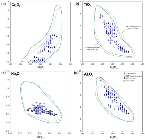OCP and MTT clinopyroxene compositions compared to compiled clinopyroxene data (after [38]) of CI (green line) and other PN intrusions (gray line). (a) Mg#cpx vs. Cr2O3 (b) Mg#cpx vs. TiO2 (c) Mg#cpx vs. Na2O (d) Mg#cpx vs. Al2O3. Pink dotted lines refer to core–intermediate–rim composition of one selected crystal from OCP facies. Orange dotted lines refer to core–rim composition of one selected crystal from MTT facies.