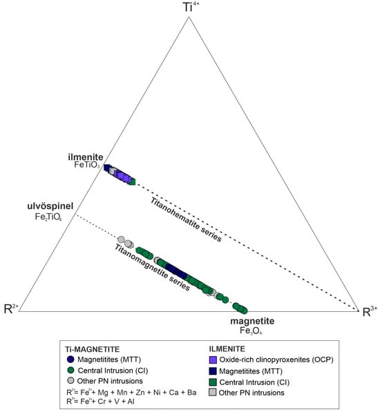 Fe-Ti oxides from OCP and MTT analyses, as with all PN intrusions, are consistent with the respective ulvöspinel–magnetite and ilmenite–hematite solid solution lines (Figure 5). Magnetite forms continuous solid solutions with ulvöspinel, originating Ti-magnetite. Ilmenites from MTT are close to the pure FeTiO3 end-member while other populations from PN, including the OCP ilmenites, are more enriched in the R3+ component (Fe3+, Cr, V, Al), mainly due to its Fe3+ content.