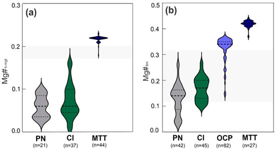 Mg# index of Ti-magnetite and ilmenite from OCP, MTT, CI and other PN intrusions. The grey field represents analyses with equivalent Mg# to other PN intrusions. (a) Mg# in Ti-magnetite. (b) Mg# in ilmenite. Abbreviations: OCP—oxide-rich clinopyroxenites, MTT—magnetitites, CI—Central Intrusion.