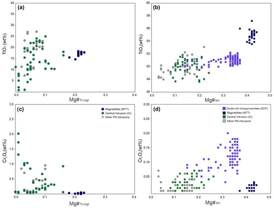 Mg# Fe-Ti oxides compositions vs.TiO2 and Cr2O3 from OCP, MTT, CI and other PN intrusions. (a) Mg# vs. TiO2 for Ti-magnetite populations. (b) Mg# vs. TiO2 for ilmenite populations. (c) Mg# vs. Cr2O3 for Ti-magnetite populations. (d) Mg# vs. Cr2O3 for ilmenite populations.