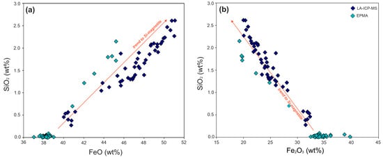 (a) SiO2 vs. FeO (wt%) analyses of Ti-magnetite populations from MTT facies. (b) SiO2 vs. Fe2O3 (wt%) analyses of Ti-magnetite populations from MTT facies. Results obtained in this study via laser ablation ICP-MS and electron microprobe (EPMA).